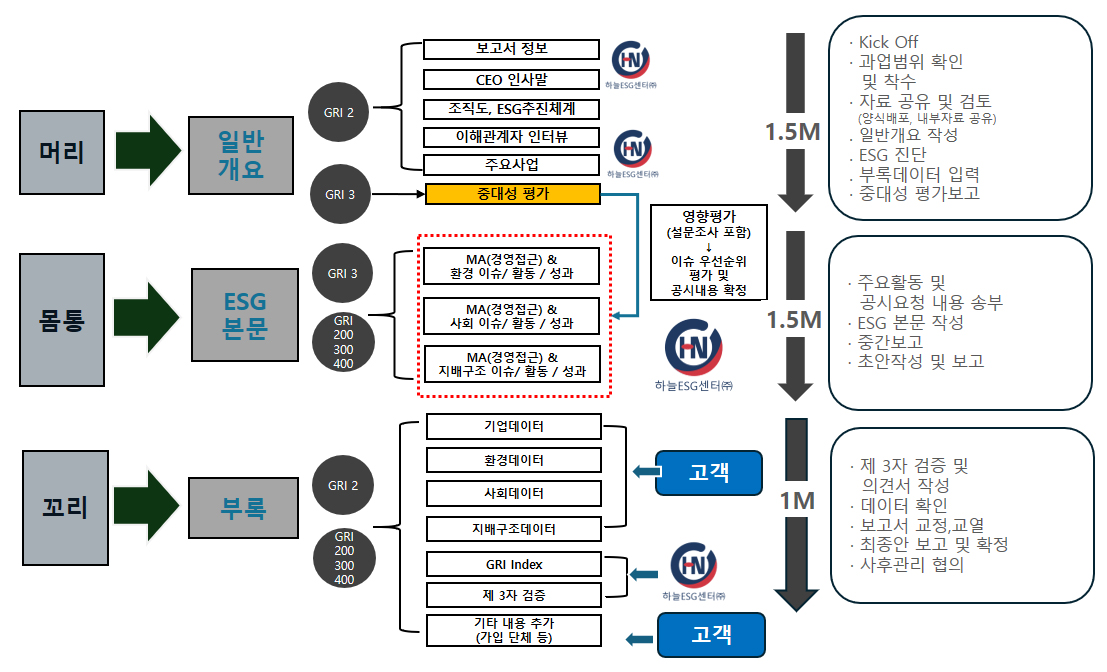 하늘ESG센터는 기획–중대성 평가–본문 작성–데이터 검증–제3자 검증–최종 발간까지 완성도 높은 보고서를 만들기 위한 체계적 20주 프로세스를 운영합니다.